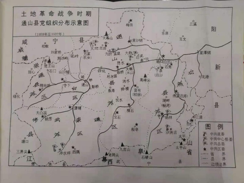 中共龙燕县委(1932.9—1937.7) 1932年9月,道委了解到敌人将重点进攻龙港的意图,将龙燕区委升格为县委,领导这一地区工作,书记余化群,苏维埃主席袁观胜,驻地先设在湖畔,后迁杨林铺。龙燕县下辖五区:龙港(今属阳新)、月涛(今通山燕厦)、月山(今通山下泉、月山一带)、杨林(今属通山)、箬田(今属江西武宁)。1933年9月改成龙武县,1934年4月改成修武通县,同年8月改成龙武通工作团,1935年春恢复修武通县委。1935年7月后,敌人以近万人的兵力分六路“围剿”太平山地区,修武通县各级干部和地方武装千余人在县委领导下,艰难地转战在太平山的崇山峻岭之中,死伤甚众,仅100余人突出重围,转移到冷水坪。1936年春夏之交,敌人在九宫山、太平山一带移民并村,修武通县游击区多次遭到敌人袭击。书记杨裕厚与程功裕、柯如银、潘际汉等人带领游击战士坚持战斗到1937年5月。杨裕厚、潘际汉等人与秦化龙取得联系,转移到山界尖,后来到平江参加整编。程功裕等10余人组成南山工作团,一直坚持到1937年8月才下山。