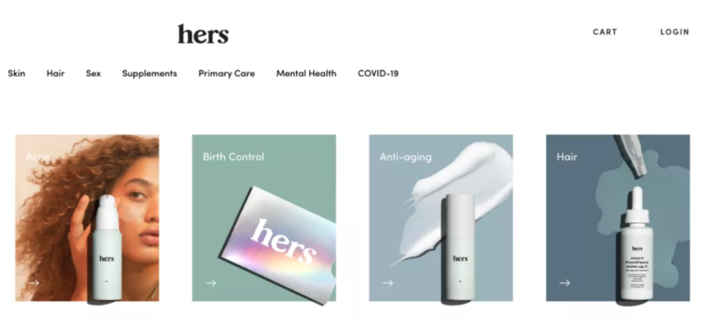 此外,Hims还拓展到女性产品线Hers。与单纯售卖美容产品不同,Hers并不在红海淘金,而是沿袭Hims的产品思路,去切医疗保健各个阶段的蛋糕,为她们提供Skin(皮肤)、Hair(头发)、Sex(性)、Primary Care(基础医疗)和Mental Health(心理健康)等场景方面的服务。