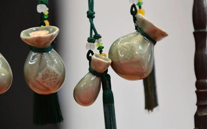 为了振兴奉化瓷源文化,今年,奉化越窑青瓷研究所落户滕头,对外免费展示越窑青瓷作品。周鸿也以奉化的历史风物为灵感,创作了一批文创产品,其中越窑绳索纹青瓷罐经过等比缩小,摇身一变成了储茶罐,西坞的水乡风景经过刻画,呈现在了青瓷茶壶之上,而最受年轻消费者喜爱的则是以弥勒布袋为原型创作的弥勒福袋挂件,蕴含着福气满满美好寓意,曾是第六届世界佛教论坛的伴手礼之一。