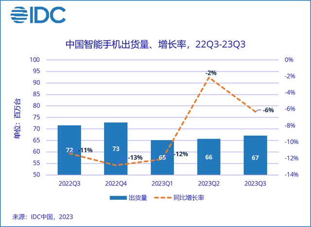 IDC最新预测:中国智能手机市场出货量有望在2023年第四季度迎来拐点,实现近10个季度的首次反弹。